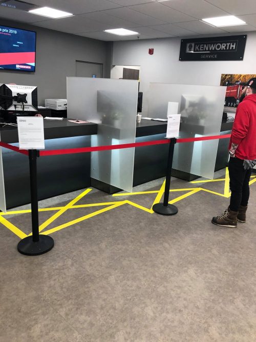 – Mise en place d’un ruban jaune face aux comptoirs des aviseurs et des commis aux pièces. Celui-ci indique la distance à respecter entre le client et l’employé. Cette mesure s’inscrit par ailleurs dans la recommandation de M. Legault quant à la distance sécuritaire minimale d’un (1) mètre. Notons également que pour l’instant, nous demandons aux clients et aux employés de ne pas se serrer la main afin de limiter les risques de contagion;