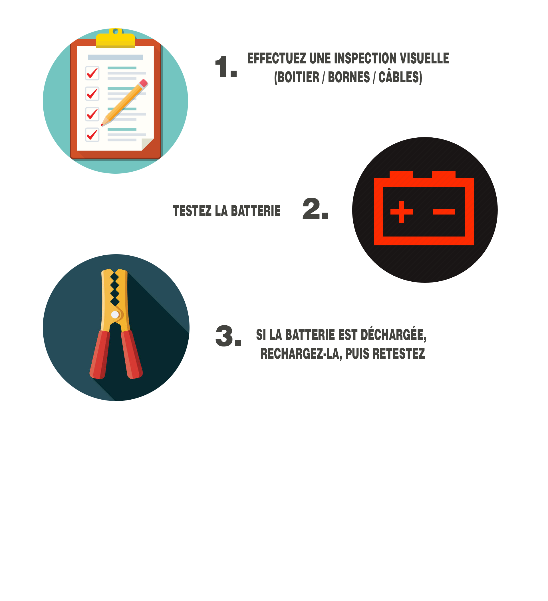 Les batteries devraient faire l’objet d’une inspection à intervalle régulier pour la présence de câbles et connexions lâches et pour tout autre problème pouvant contribuer à une défaillance prématurée. Nous recommandons d’effectuer une inspection visuelle et un test de niveau de charge des batteries à chaque visite d’entretien régulier afin d’identifier et de réparer tout problème avant qu’il ne dégénère en défaillance.